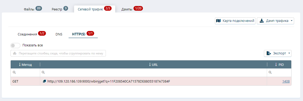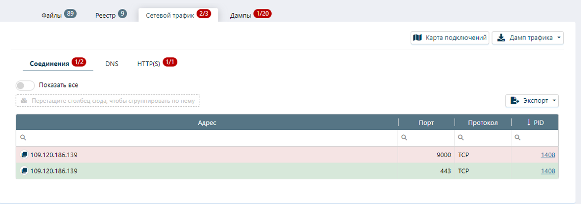 Во вкладке «Соединения» отображаются сетевая активность исследуемого файла и созданные подключения к сторонним источникам: