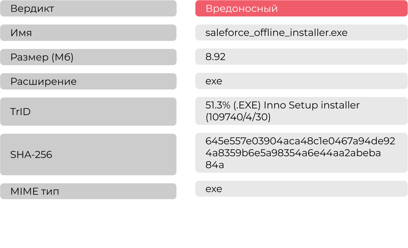 На анализ в систему Афина пришел исполняемый файл с расширением .exe. Для начала была собрана его общая информация, представленная в таблице Таблица 1.