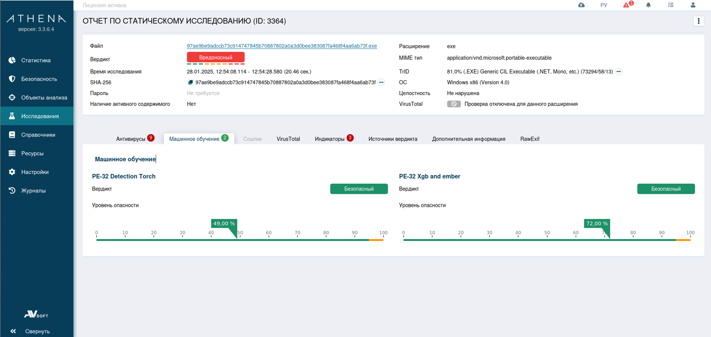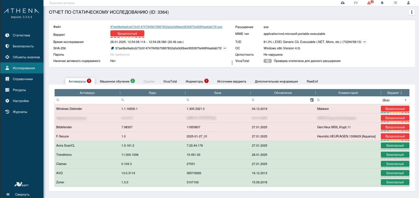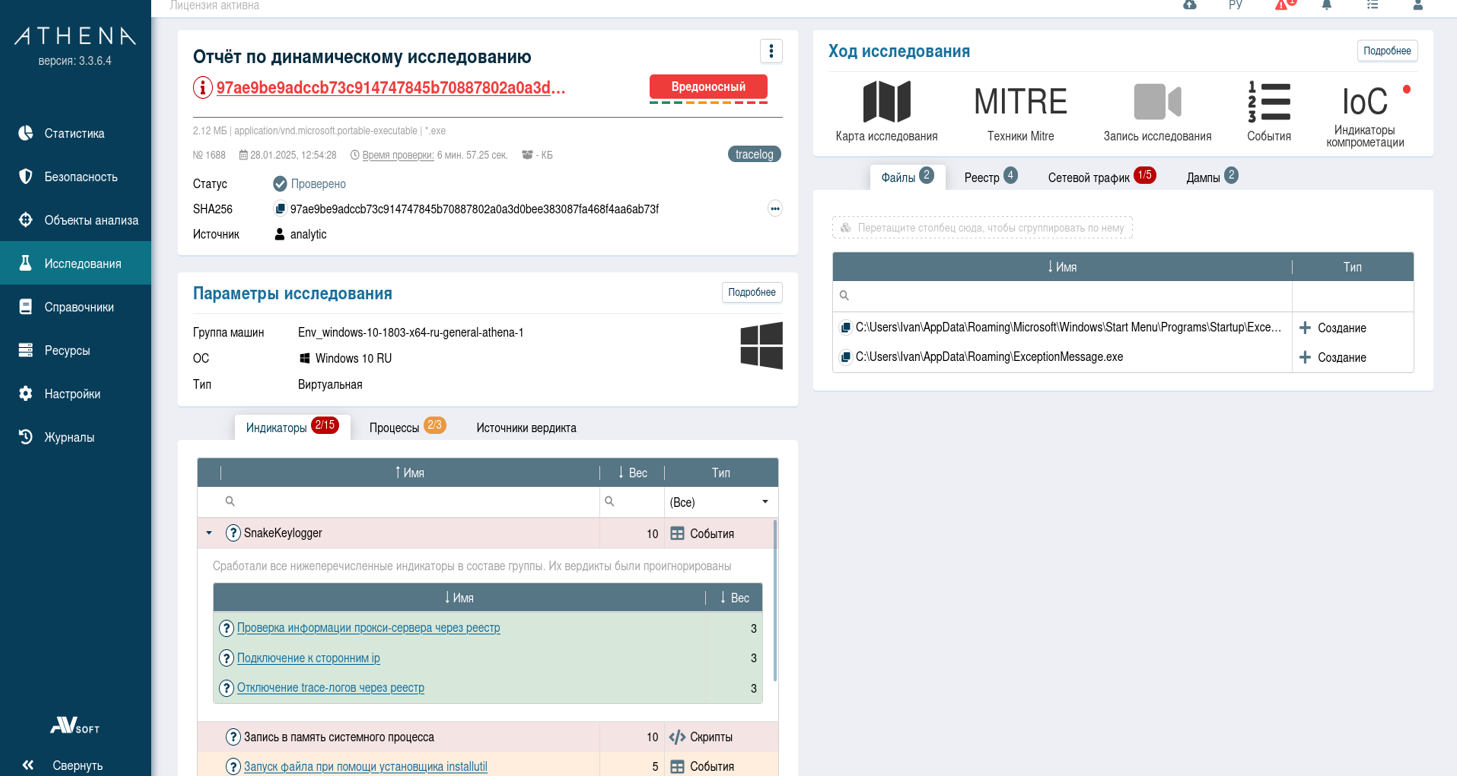 При динамическом анализе в системе ATHENA сработало несколько индикаторов: