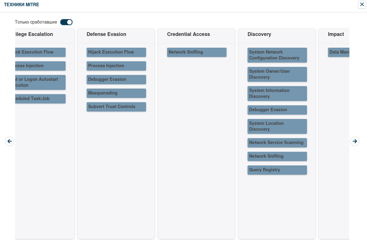 Во вкладке “Техники MITRE” видно, что отработало несколько техник. Стоит отметить следующие: