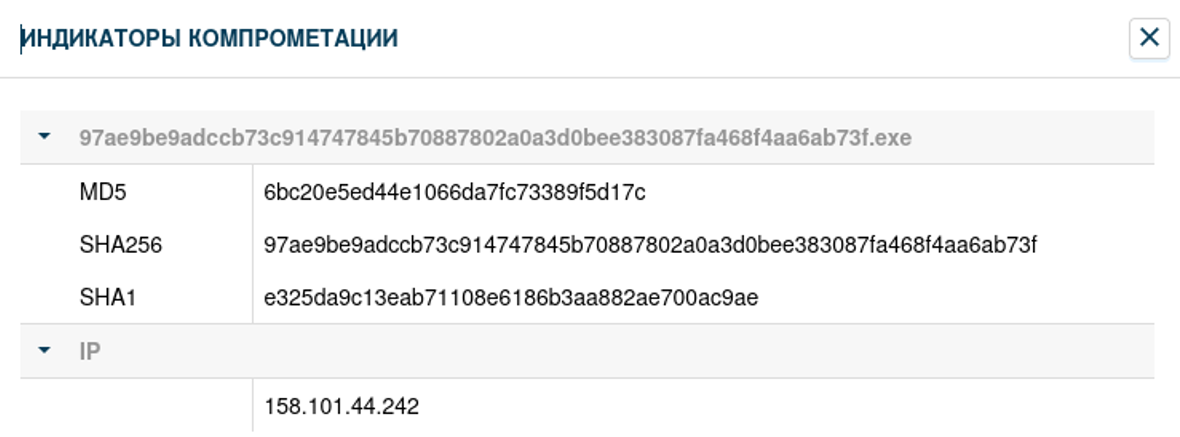 Во вкладке “Индикаторы компрометации” отображаются индикаторы компрометации вредоносного поведения файла по результатам его проверки в «песочнице».