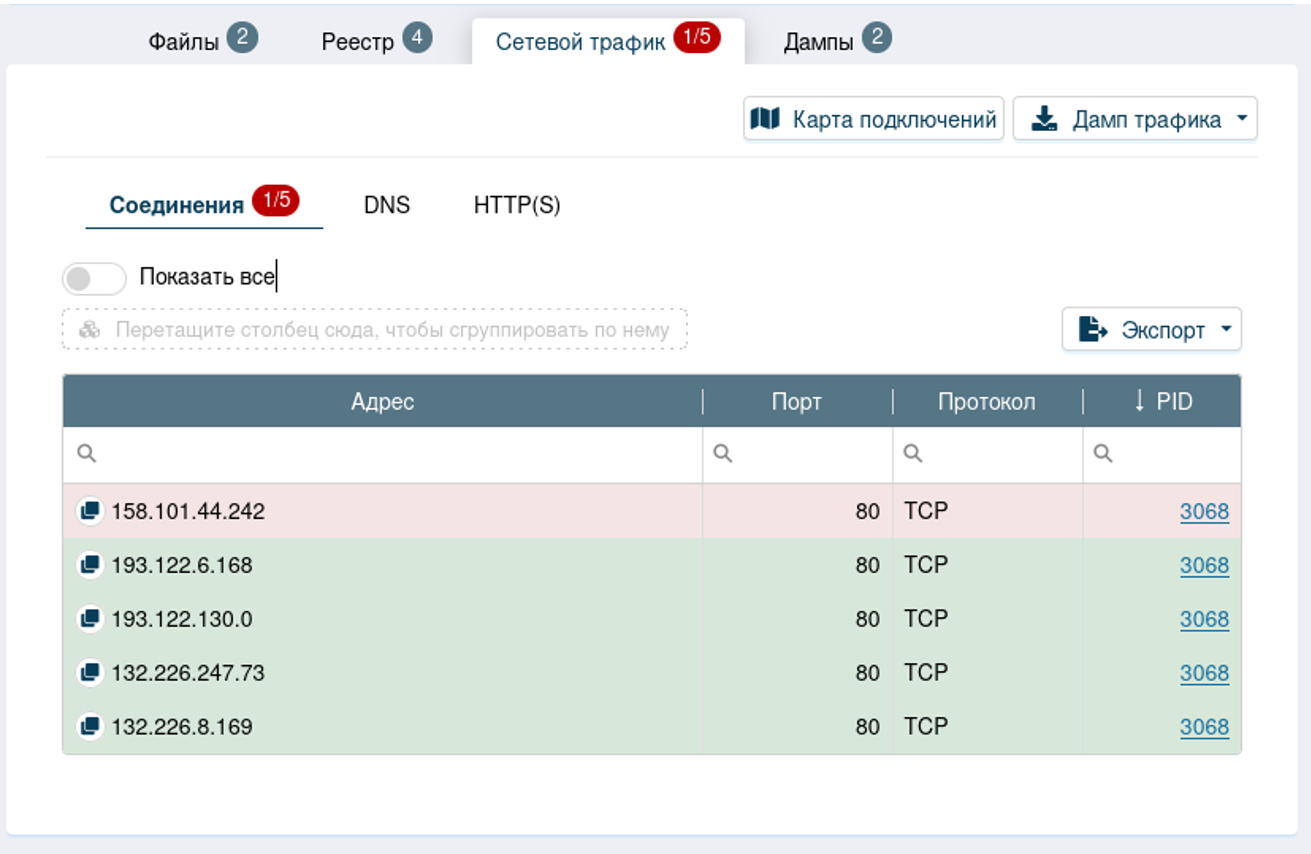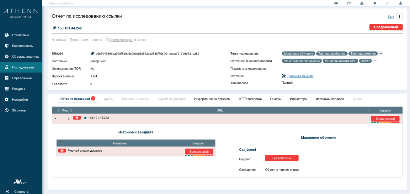 Во вкладке «Сетевой трафик» видим, что была обнаружена вредоносная ссылка. При переходе в отчет можем увидеть, что она была помещена в черный список доменов.