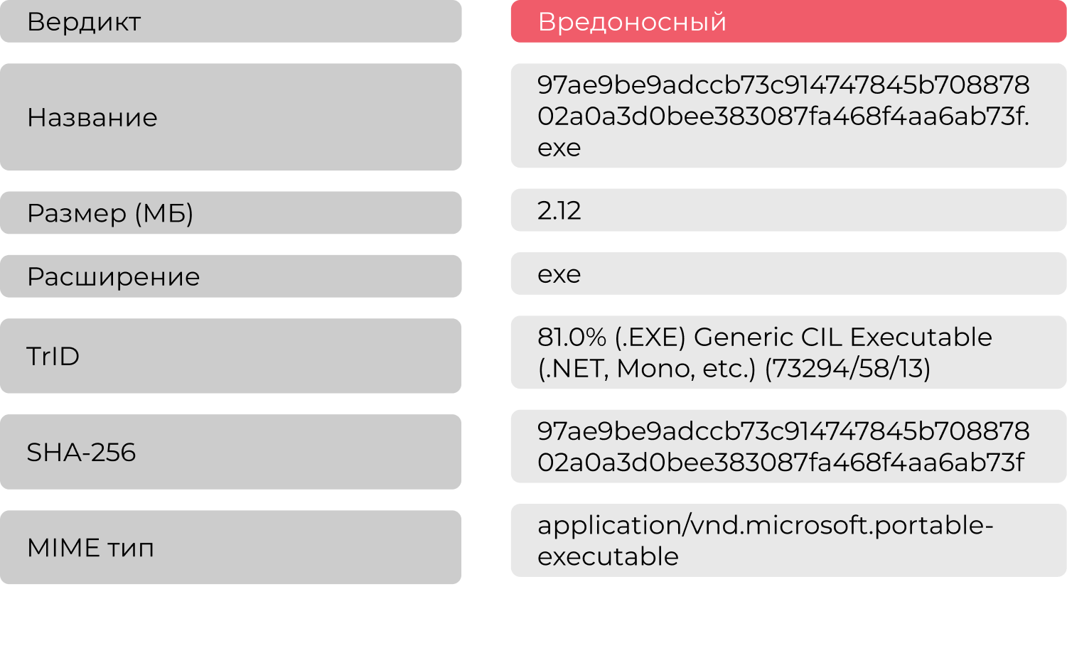 На анализ в систему Афина пришел исполняемый файл с расширением .exe. Для начала была собрана его общая информация, представленная в таблице Таблица 1.