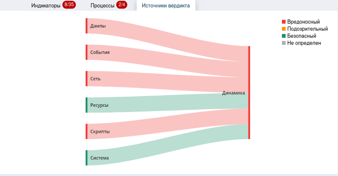 Во вкладке «Источники вердикта» можно ознакомиться с тем, какие источники посчитали файл вредоносным.