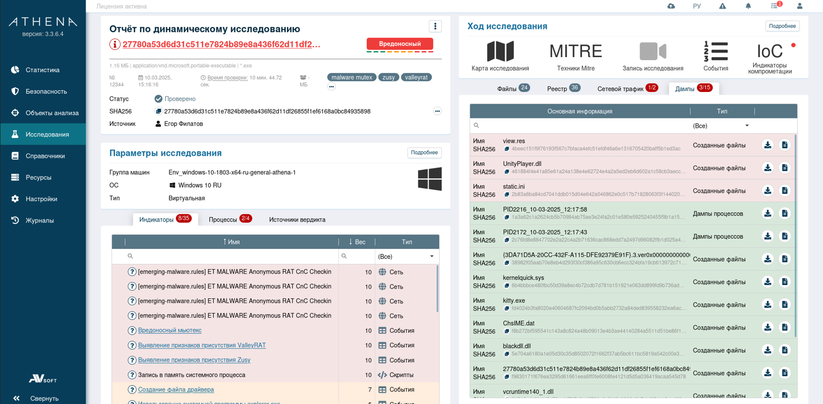 Динамический анализ в системе ATHENA выявил несколько индикаторов: