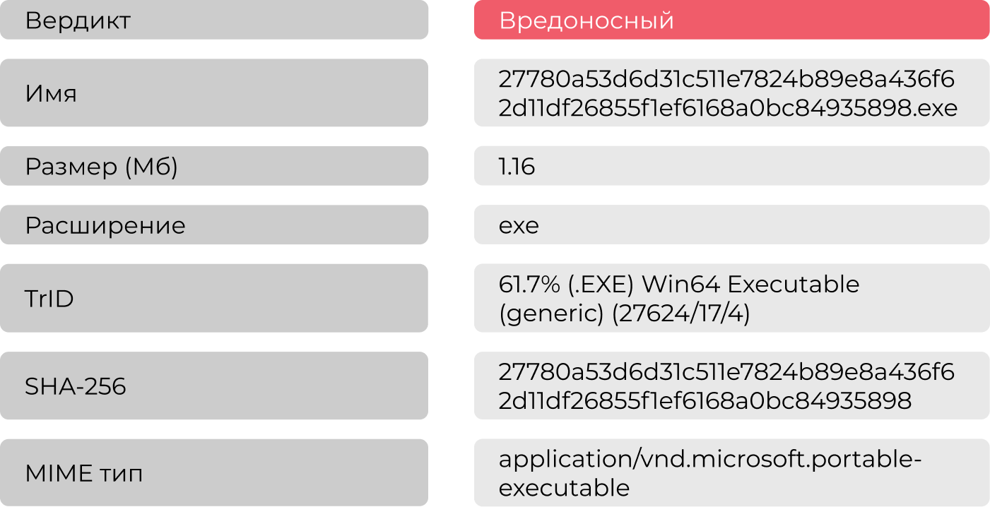На анализ в систему Афина пришел исполняемый файл с расширением .exe. Для начала была собрана его общая информация, представленная в таблице Таблица 1.