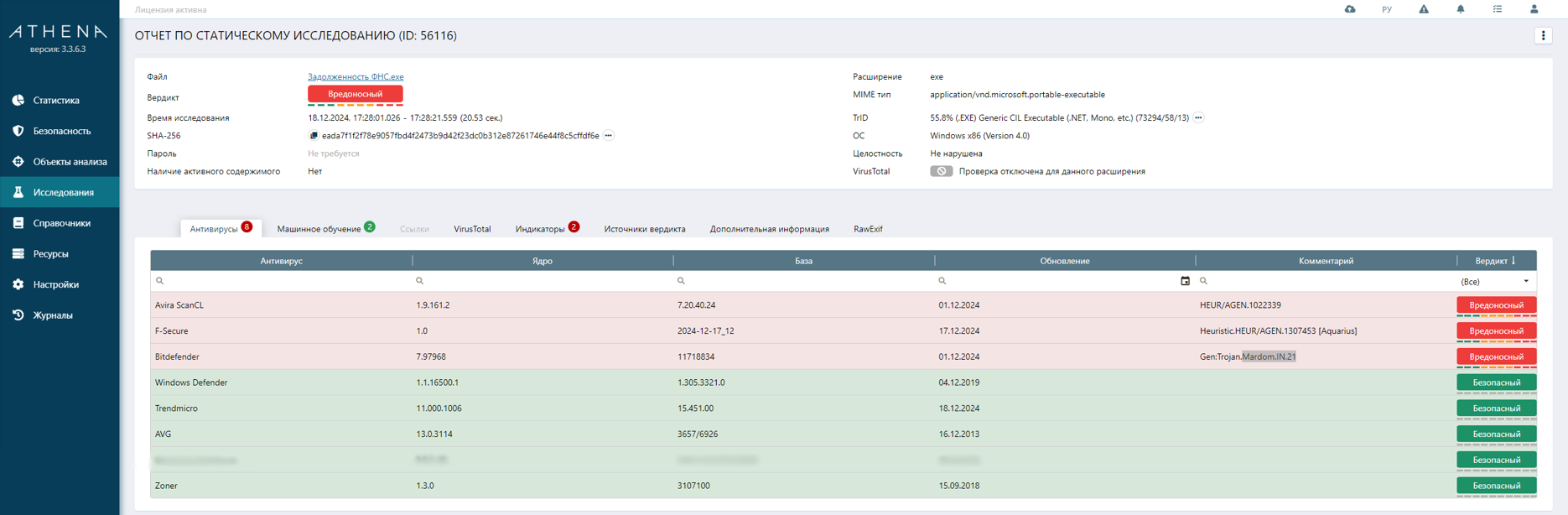 Исследования файла происходило с помощью системы ATHENA и ручного исследования (реверс-инжиниринг). Для начала посмотрим на статический и динамический анализ файл в системе ATHENA