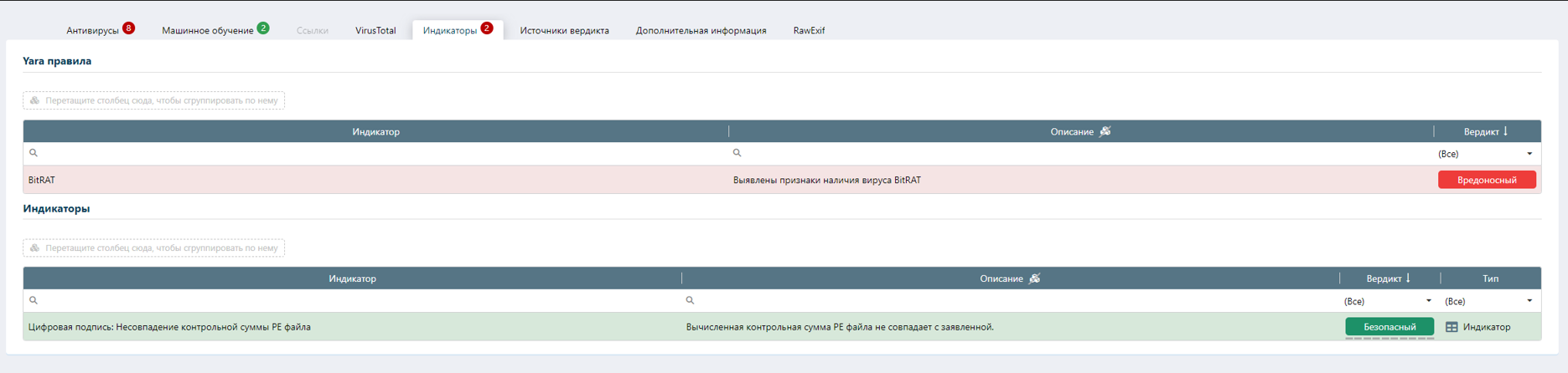 Во вкладке «Индикаторы» видно, что обнаружено совпадение сигнатуры системным YARA-правилом: BitRAT. В том числе, информационный системный индикатор «Цифровая подпись: Несовпадение контрольной суммы PE файла».