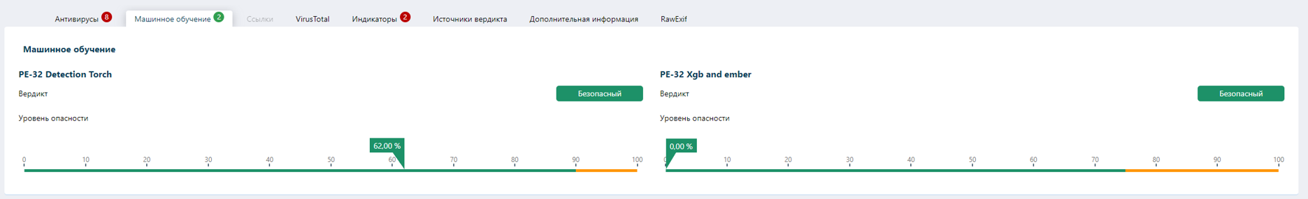 Во вкладке «Машинное обучение» видим, что моделями машинного обучения исследуемому файлу присвоен уровень опасности 62%. Подозрительный вердикт по градации оценивается от 90%, этот параметр можем изменить в настройках работы системы, однако текущая градация является оптимальной для работы системы.