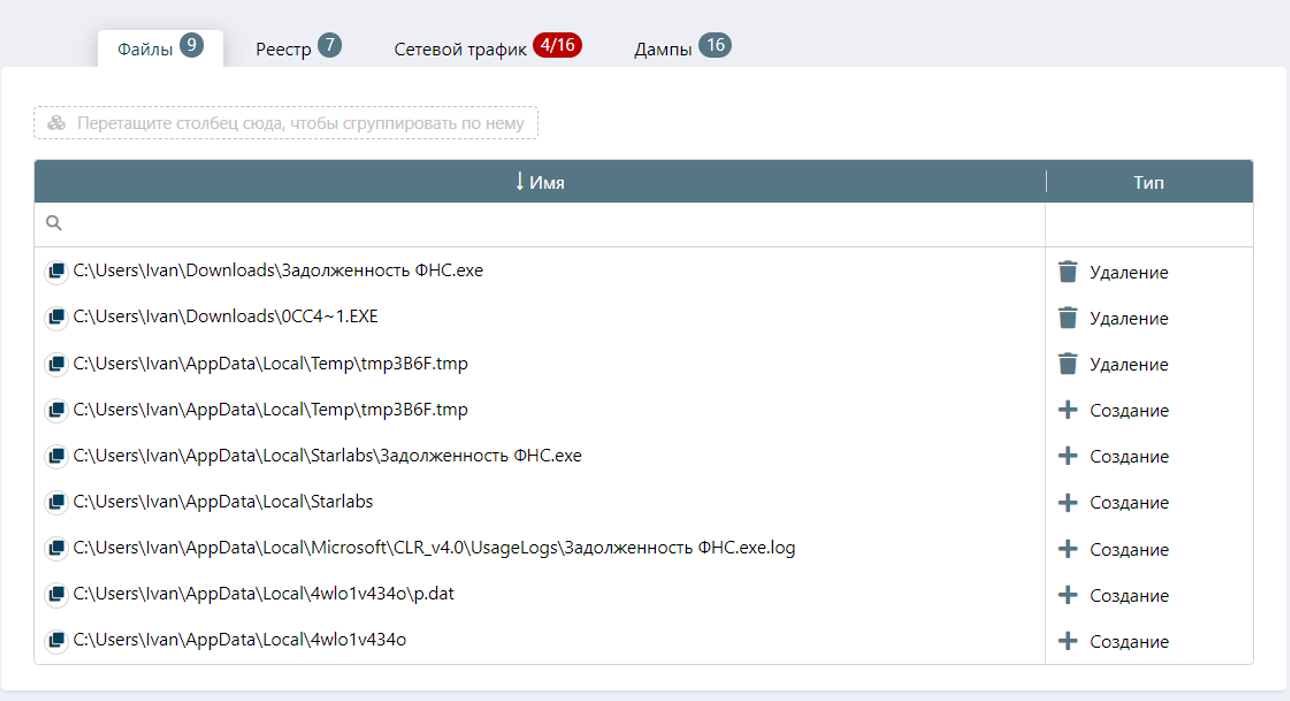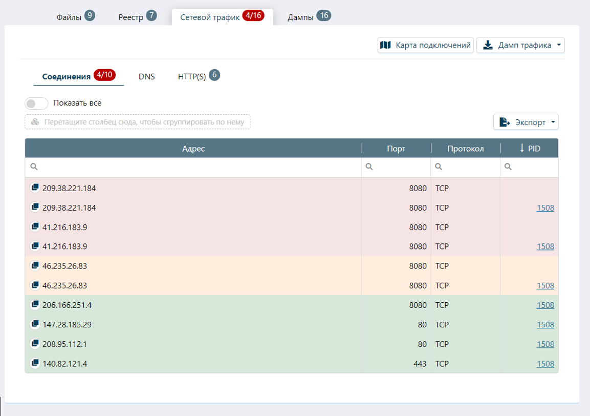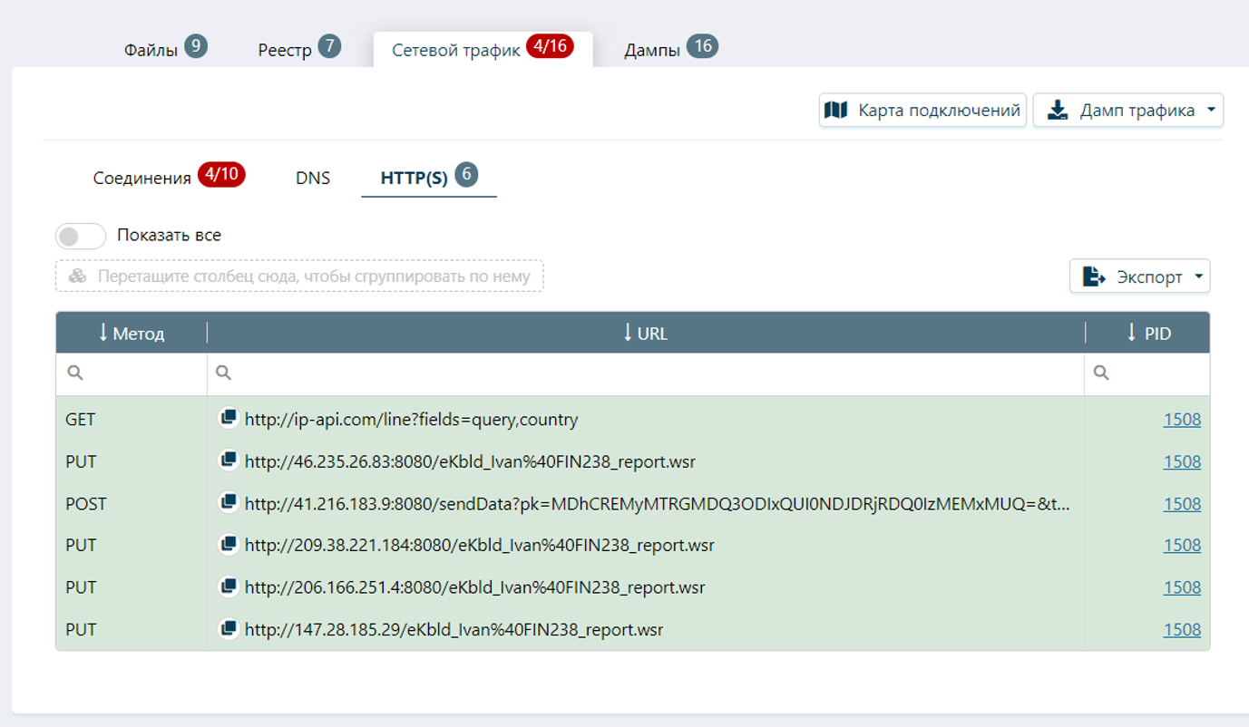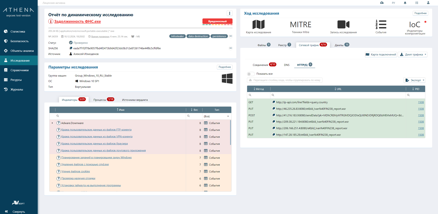 Все события, полученные дампы, созданные соединения объединяются в общий вердикт по динамическому исследованию: