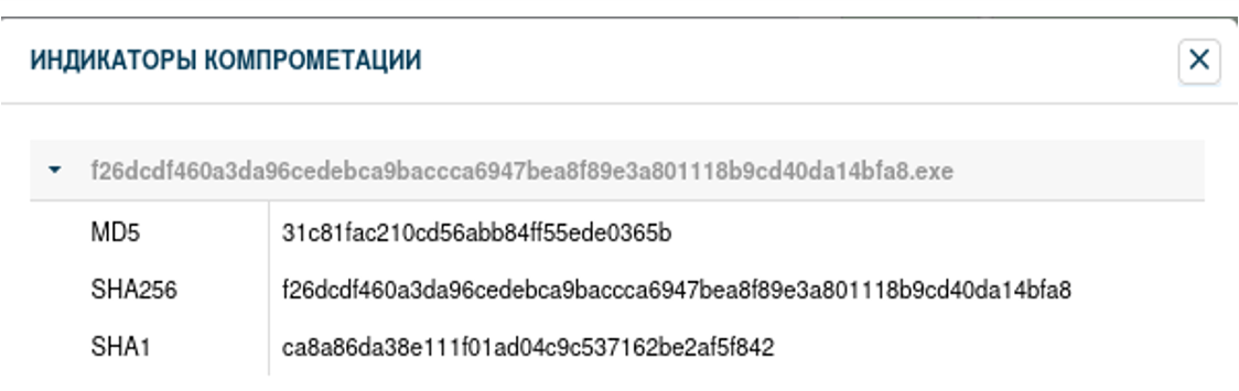 Во вкладке “Индикаторы компрометации” отображаются индикаторы компрометации вредоносного поведения файла по результатам его проверки в «песочнице».