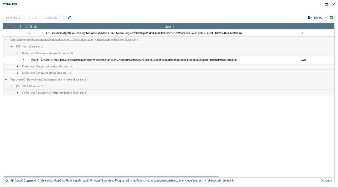 5) Boot Or Logon Autorstart Execution. Сработавшие индикаторы: Изменение ключа реестра для автоматического запуска приложений, Изменение содержимого папки автозагрузки, Установка значения ключа автозагрузки.
