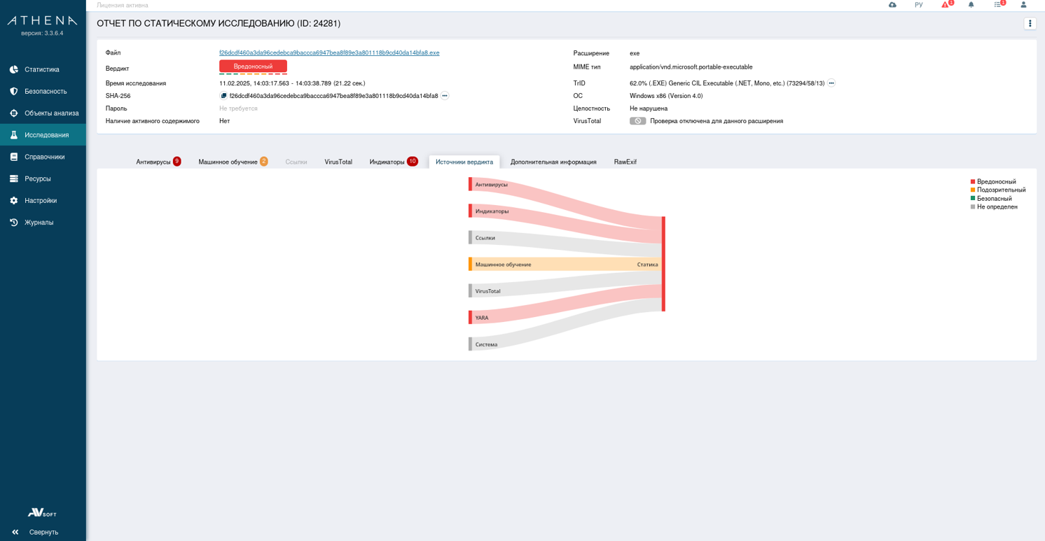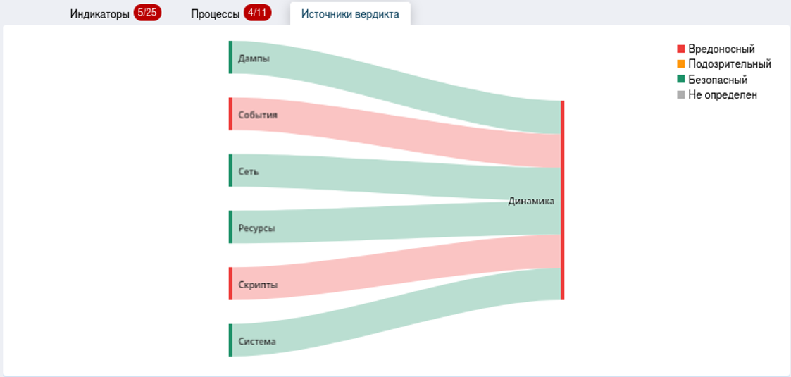 Во вкладке «Источники вердикта» строится графическая карта с источниками и их вердиктами, а также общим вердиктом по исследуемому файлу.
