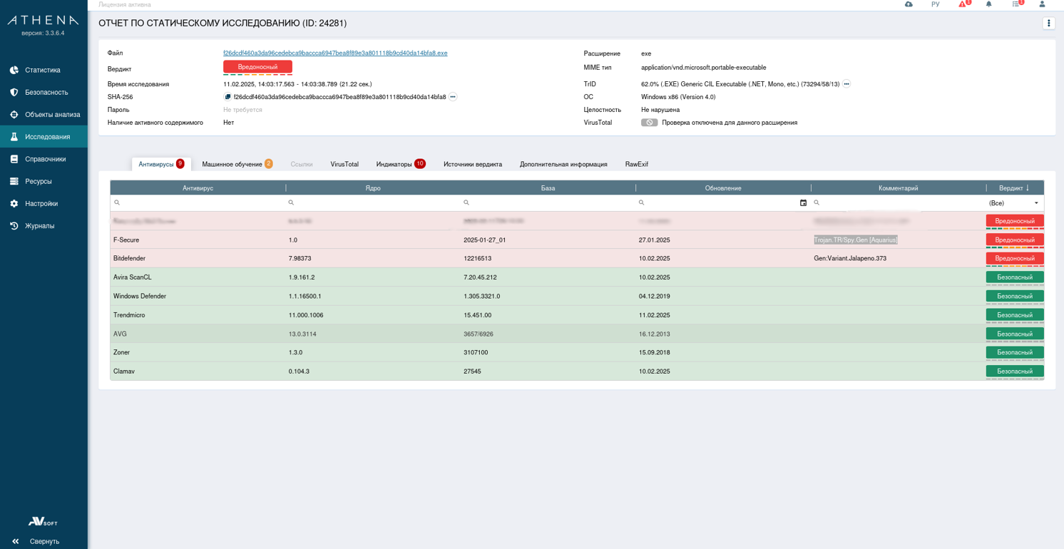 Исследования файла происходило с помощью системы ATHENA. Для начала посмотрим на статический и динамический анализ файл в системе ATHENA.