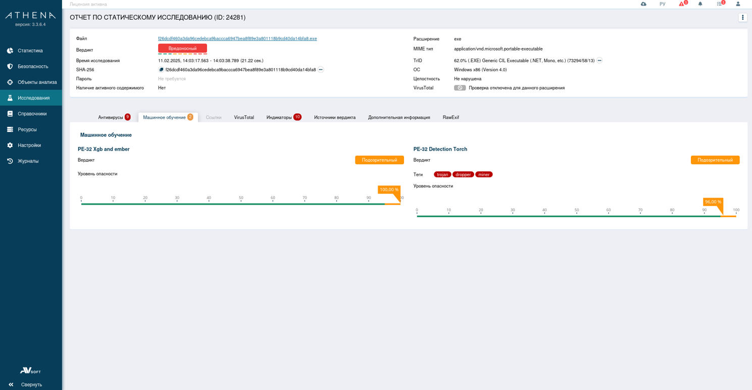Модули машинного обучения выдали подозрительный вердикт, указав теги : trojan, dropper, miner.