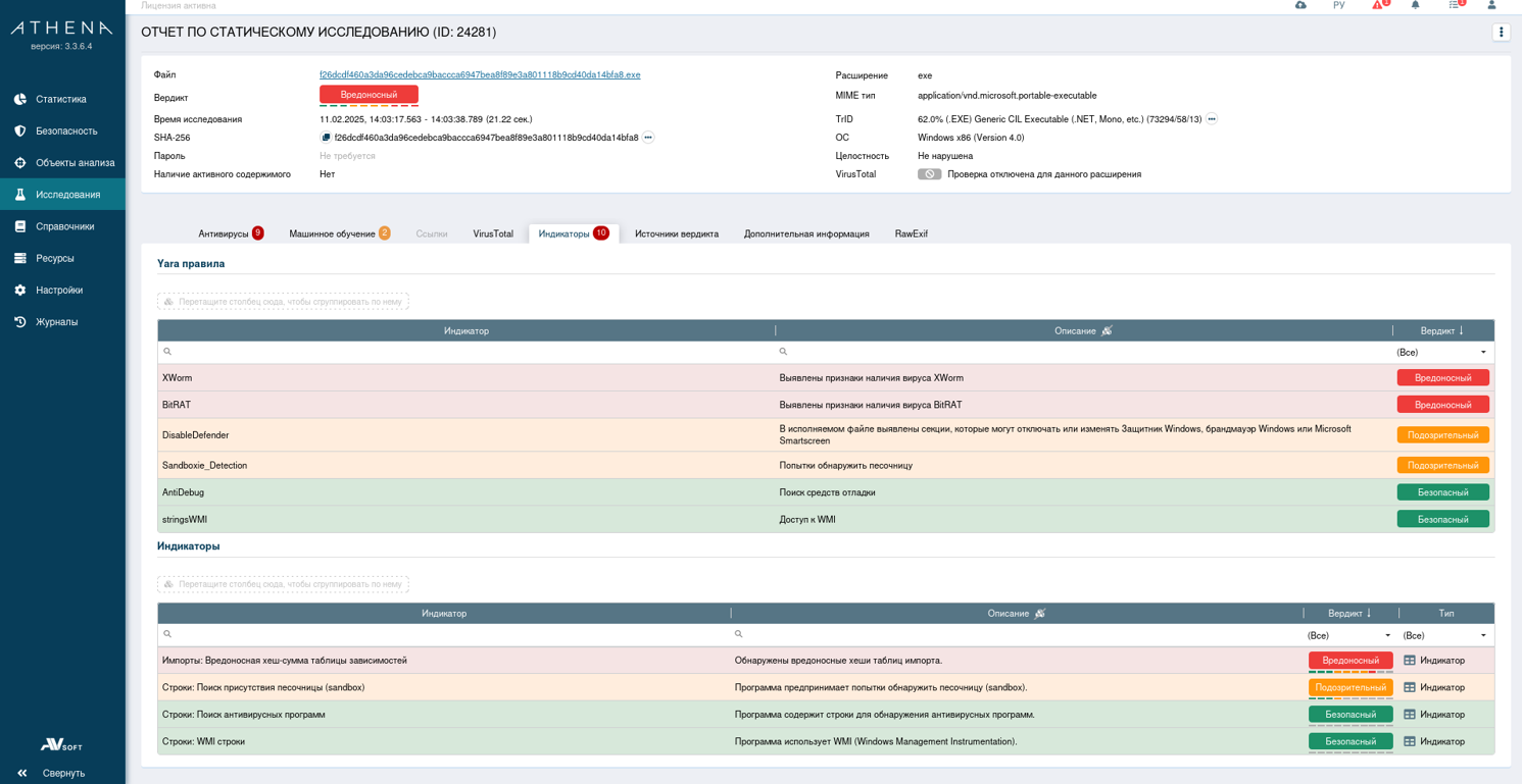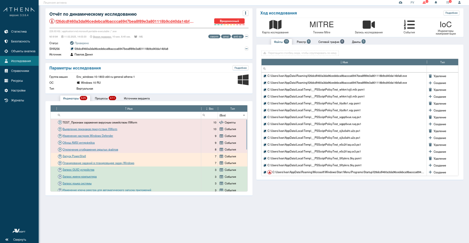 Динамический анализ в системе Афина выявил множество вредоносных индикаторов. Среди них отмечаются: