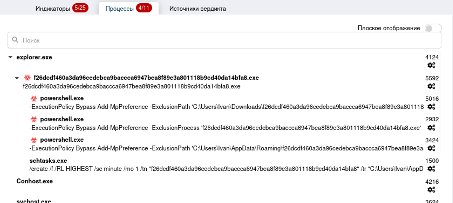 Среди системных программ, выявленных в процессе динамического исследования, были выявлены такие как: powershell.exe, schtasks.exe, Conhost.exe и svchost.exe.