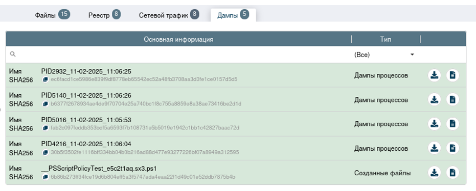 В блоке «Ход исследования», можно наблюдать, изменения файлов/ключей реестра, наличие сетевого трафика, а также создание дампов с различными расширениями.