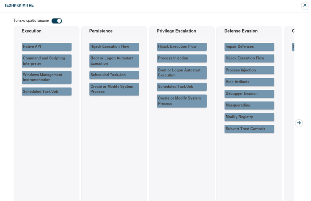 Во вкладке “Техники MITRE” видно, что отработало множество техник,вот самые интересные из них:
