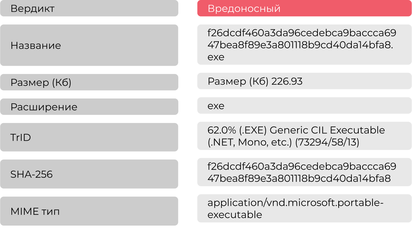 На анализ в систему Афина пришел исполняемый файл с расширением .exe. Для начала была собрана его общая информация, представленная в таблице Таблица 1.